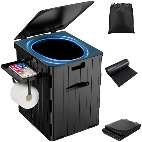 PAHTTO Toilettes de camping portables pliables pour adultes avec étagère amovible pour téléphone et support de papier toilette, pot Porta avec couvercle (noir)