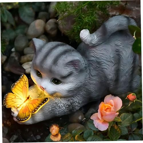 Statues extérieures, lumières solaires de chat jardin extérieur avec simulation de papillon solaire figurines de chat, résine colorée de chat de chat, pour le patio de jardin de la maison, gris