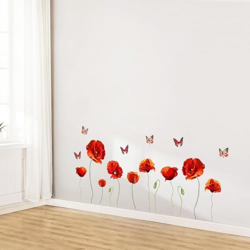 PLIGREAT Coquelicots Sticker Mural Pépinière Cuisine Salon Chambre Salle Bureau Couloir Décoration Fleurs Rouges Papillon Stickers Muraux DIY Stickers Murals