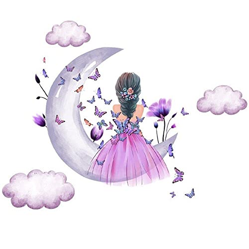 Fopytu Petite Fille Papillon Stickers Muraux Violet Papillon Sticker Mural Lune Nuage Sticker Autocollants Fée Princesse Room Decor pour Filles