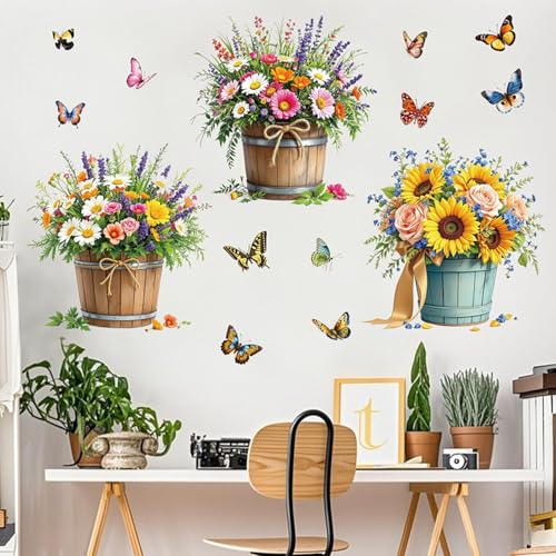 FUFUQUARE Autocollants Muraux Pot de Fleurs Papillon Coloré Stickers Muraux Floraux en Bouquet Bonsaï Décoration pour Salon Cuisine Chambre à Coucher Porte Meubles