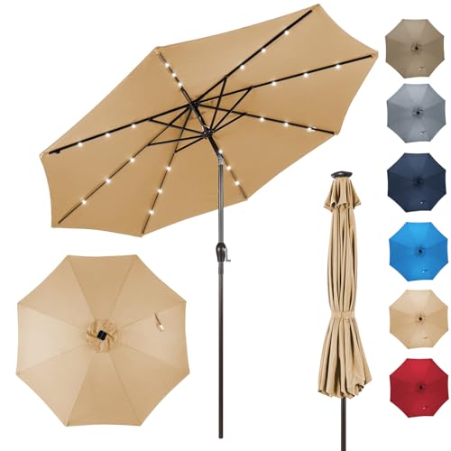 GOPLUS Parasol de Jardin Exterieur 2,7M, Grand Parasol Inclinable avec Lumineux Solaire 18 LED, 6 Baleines, Manivelle, Anti-UV, pour Plage Balcon Patio, Base Non Incluse (Café)