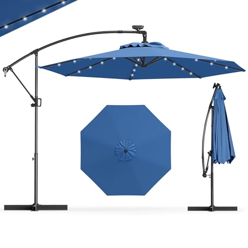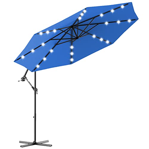 GOPLUS Parasol Solaire Déporté avec 24 LED, Manivelle, Hauteur Réglable, Anti-UV, Inclinable 8 Baleines pour Balcon Patio, Base Non Incluse (Bleu)