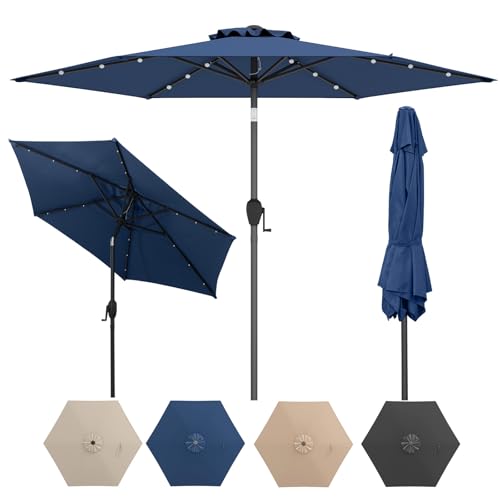 GOPLUS 3M Parasol Deporte avec 32 LED Solaires, Parasol de Jardin Extérieur 8 Baleines avec Tissu Protection Solaire, Rotatif à 360° pour Patio, Base Non Incluse (Bleu Foncé)