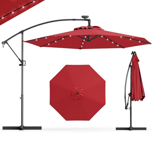 COSTWAY Parasol Déporté Professionnel 3M, Grand Parasol de Jardin Extérieur 32 LED Solaire avec Manivelle, Inclinable et Rotation à 360°, Base Croisée, pour Patio, Terrasse, Balcon (Rouge)