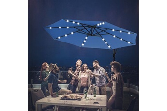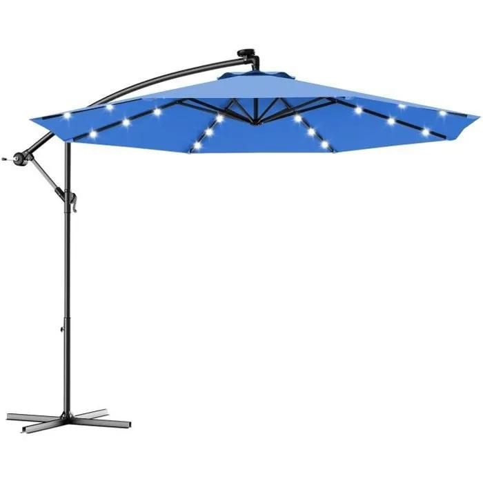 parasol bleu déporté 3m hauteur 250 cm avec 24 led lampe solaire en polyester inperméable et 8 baleines en fer pour jardin