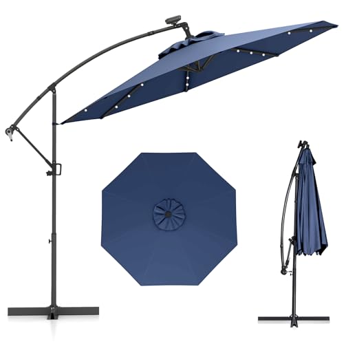 GOPLUS Parasol Déporté avec 112 Lumières LED, Parasol de Jardin Exterieur avec Manivelle, Protection Solaire, Parasol Inclinable Suspendu pour Patio, Cour, Terrasse, Base None Incluse (Bleu)