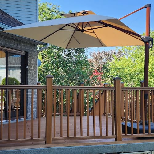 PURPLE LEAF Parasol De Jardin Extérieur, Parasol Déporté 3,65 x 3,65 m, Environ 13,3 m², Grain de Bois en Aluminium, Toit à Double Rotatif 360°, Plus Adapté aux Jardins Carrés Haut de Gamme, Beige