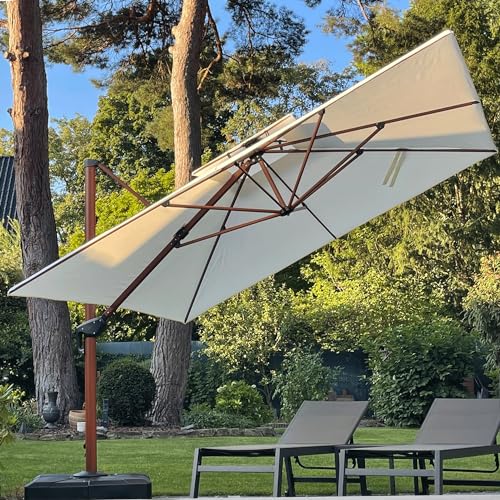 PURPLE LEAF Parasol De Jardin Extérieur, Parasol Déporté 3,65 x 3,65 m, Grain de Bois en Aluminium, Protection UV Automne, Toit à Double Rotatif 360°, Convient aux Villas Haut de Gamme, Crème