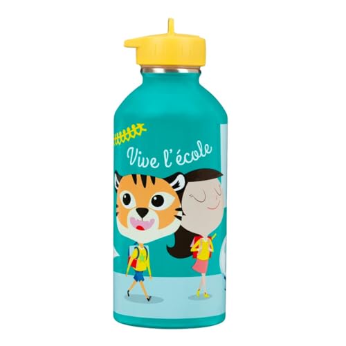 Gourde enfant Acier inoxydable DRAEGER PARIS - Facile à nettoyer - gourde réutilisable - Idéale pour parc, école - Contenance 300ml - 17 cm x 6,5 cm - Vert turquoise - Message inscrit : Vive l'école