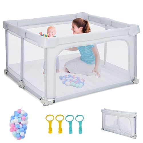 FANTASK Parc portable pour bébé avec parois en filet et porte, pliable avec 4 poignées, 50 balles, fonction de verrouillage, parc pour nourrissons et enfants, 124 x 124 cm, gris clair