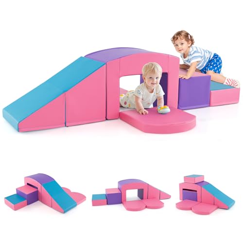 GOPLUS 7 PCS Parcours de Motricité Bébé, Module Motricité en Mousse PU avec Remplissage en EPE, Jouets Montessorris Éducatifs pour Enfants 12 Mois+ (Rose+Violet)