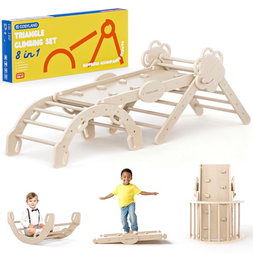 COSYLAND Triangle d’Escalade Montessori 8-en-1 en Bois, Arche Pliable pour Enfants 1-6 Ans, Parcours de Motricité Hauteur Réglable, Charge 80 kg, Boîte Cadeau Colorée (Naturel)