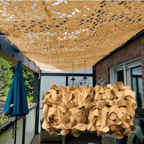 Filet Camouflage Renforcé Beige 6X7m Filet Pare-Soleil Exterieur Voile d'Ombrage Résistant Filet de Camouflage Militaire Équipement de Plein Air Réutilisable pour Camping Chasse Décorations de Fête