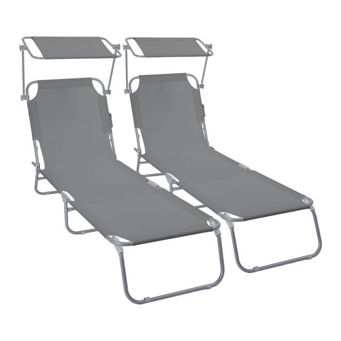 VOUNOT® Lot de 2 Chaise longue pliante avec pare soleil - Transat 4 positions - Bain de soleil portable en polyester - Gris