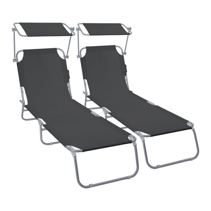 tectake® Set de 2 Chaises Longues Pliantes avec Pare Soleil & Appuie-tête - Transat Inclinable de Plage, Relax pour Jardin, Camping, Salon Exterieur - Gris