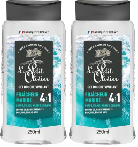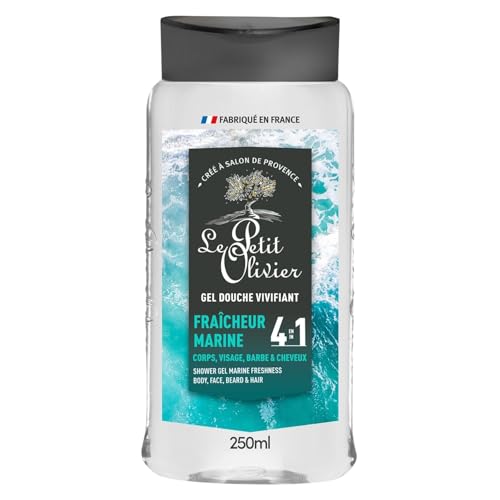 LE PETIT OLIVIER - Gel Douche Homme 4 en 1 - Fraîcheur Marine - Corps Visage, Barbe & Cheveux - Parfum Frais & Vivifiant - Nettoie en Douceur - PH Neutre Pour la Peau - Fabriqué en France - 250ml