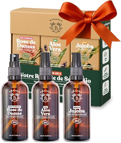Bionoble Coffret Beauté Femme 3x100ml - Eau de Rose, Gel Aloe Vera et Huile de Jojoba Bio - Soins pour le visage, le corps et les cheveux - Coffret Cadeau Femme