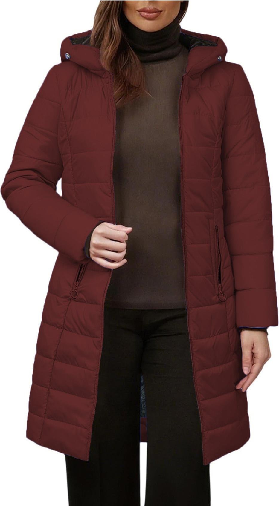 ASKSA Manteau d'hiver Femme Doublé chaud Veste matelassée longue Parka d'hiver Veste polaire coupe-vent Veste d'extérieur avec capuche (Rouge vin,L)