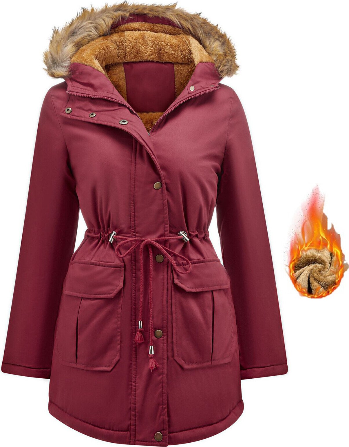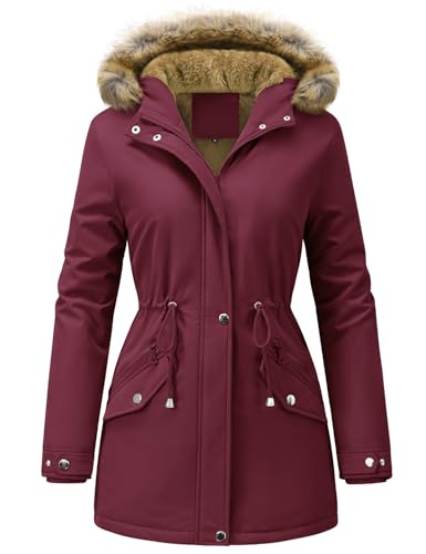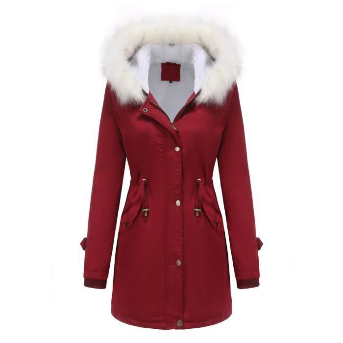 ASKSA Manteau d'hiver Femme Veste d'hiver avec capuche en fourrure Épais Chaud Parka d'hiver Zipper Manteau Parka Coupe-vent Veste polaire Veste de transition (Rouge vin,L)