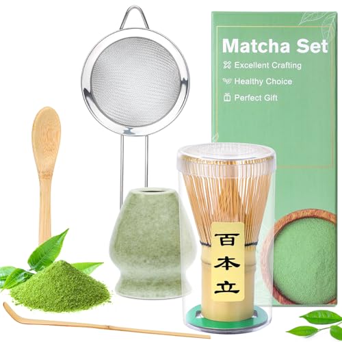 Alyvisun Matcha Kit, 5 Pièces Matcha Set avec Chasen et Support pour Fouet Matcha, Passoire, Cuillère à Thé, Spatule à Thé, Accessoire Matcha pour les Passionnés, Idéal pour Débutants et Amateurs