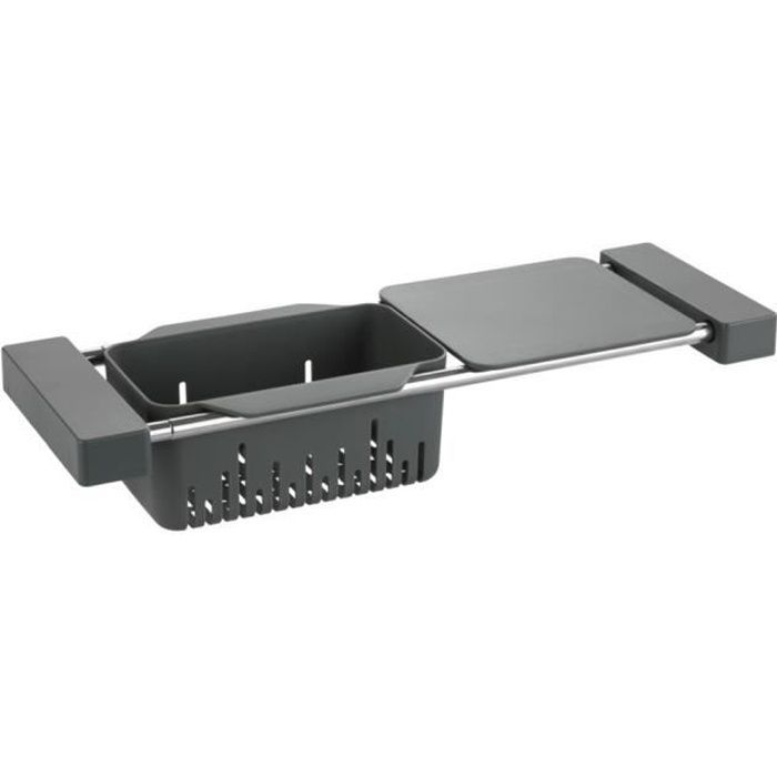 WENKO Organiseur évier 3en1 : Panier de rangement, Passoire et Planche à découper extensible, Cami, acier inox - plastique, gris mat