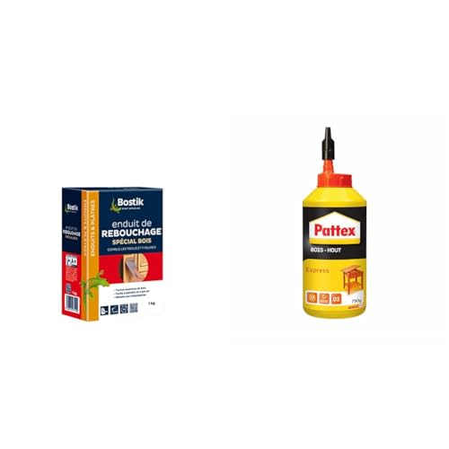 Bostik Enduit de Rebouchage Prêt à l'Emploi Spécial Bois – Pâte à Bois en Poudre – Intérieur & Pattex | Colle Bois Express (biberon de 750 g) – Colle à bois transparente à séchage rapide