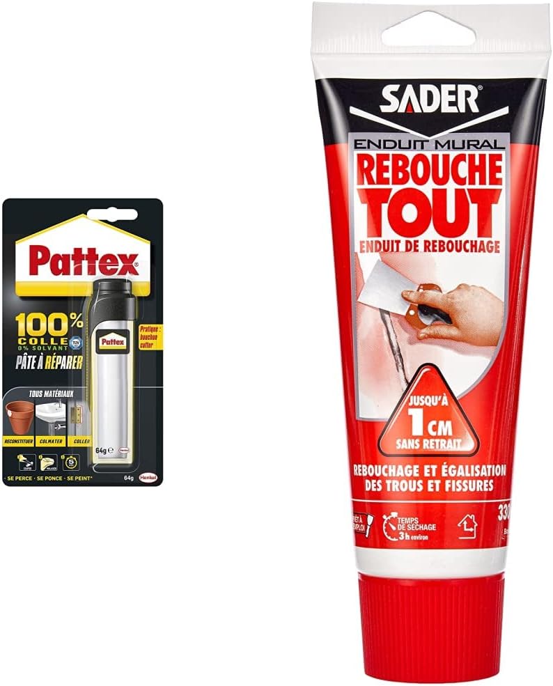 Pattex 100% Pâte à réparer multi-usages, Pâte epoxy bi-composante pour collages & Sader Rebouche Tout – Enduit de Rebouchage Intérieur Prêt à l’Emploi – Tous Supports – Rebouchage et Égalisation