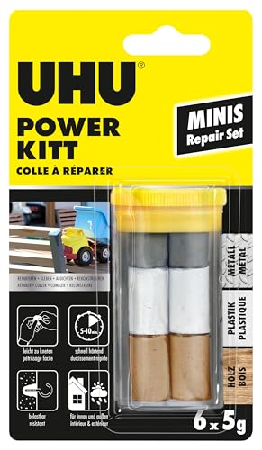 UHU Power kitt - Pâte à Réparer Minis - Formule Epoxy Extra Forte - Tous Matériaux & Surfaces - Intérieur/Extérieur - Résistante à L'Eau - Gris - Tube de 6 x 5 g