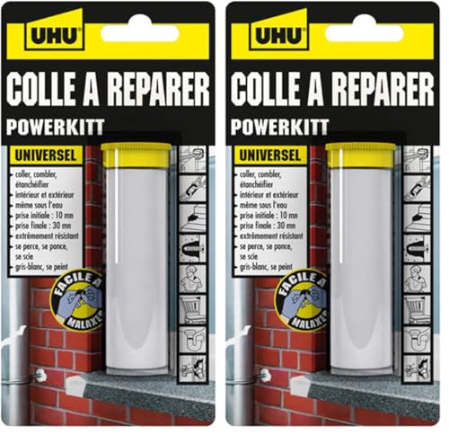 UHU Colle à réparer Powerkitt universel - Pâte époxy pétrissable 2 composants ultra rapide et solide pour coller, combler, étanchéifier, réparer, intérieur et extérieur, Gris, 60g (Lot de 2)