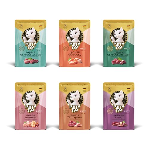 KITTY Cat Paté Mix 2, 6 x 85 g, Nourriture Humide pour Chat dans Un Paquet d'essai, Nourriture pour Chat sans céréales avec Taurine, Huile de Saumon et Moule aux orles Vertes, Aliment Complet à Haute