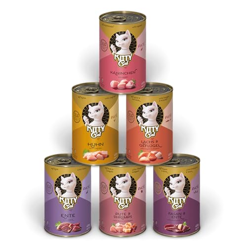 KITTY Cat Paté Mix 1, 6 x 400 g, nourriture humide pour chat dans un paquet d'essai, nourriture pour chat sans céréales avec taurine, huile de saumon et moule aux orles vertes, aliment complet à haute