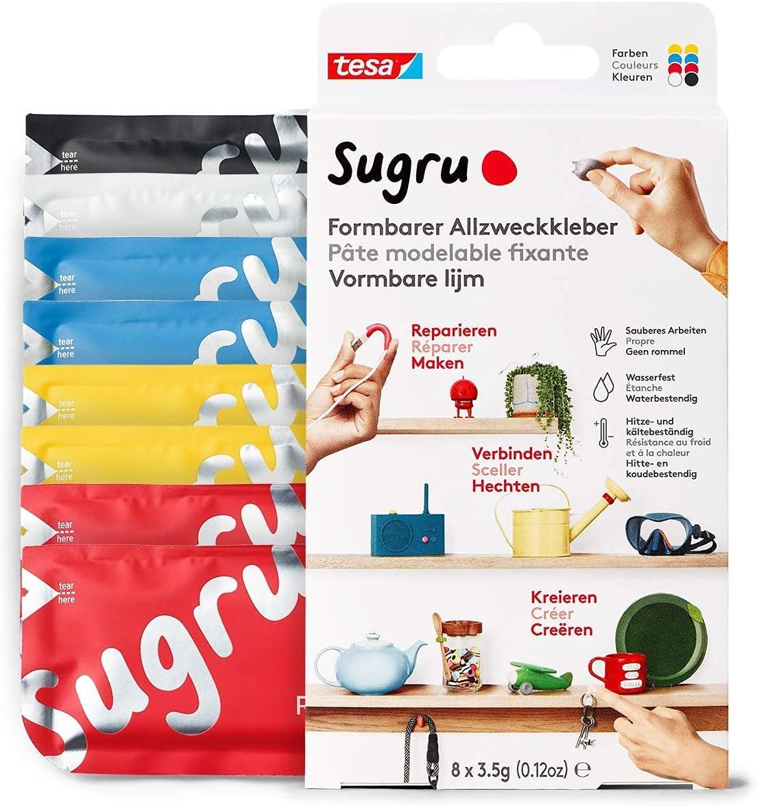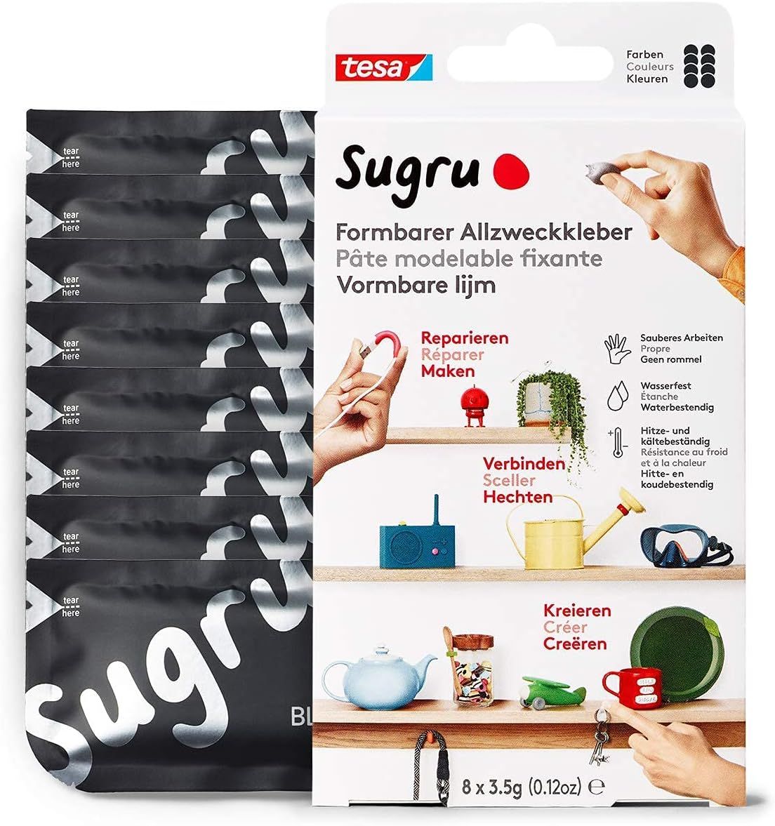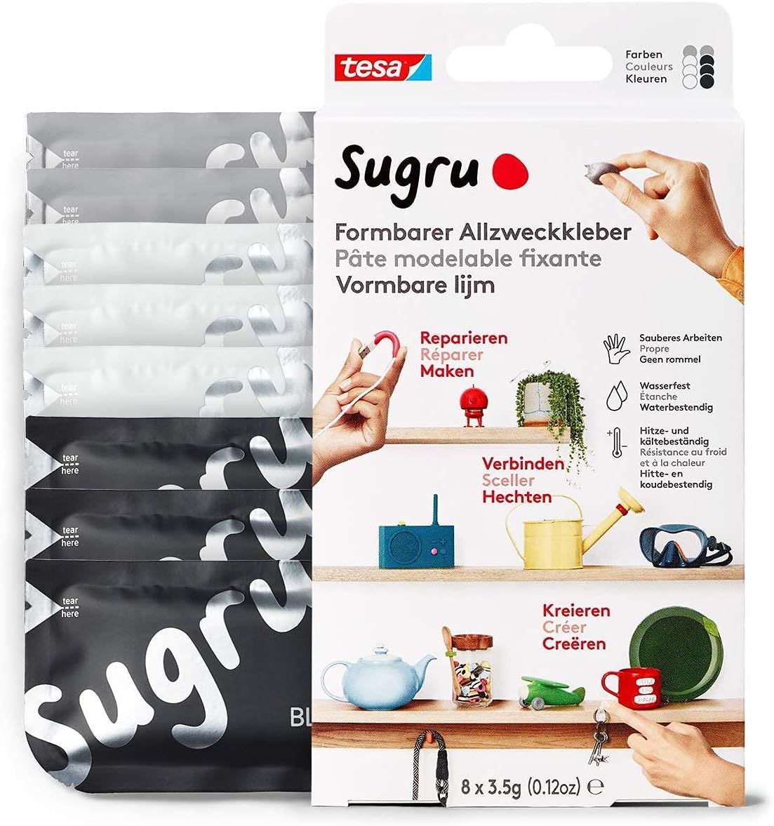MEVRONISSHOP-Sugru by tesa - Pâte Fixante Polyvalente à Modeler en Lot de 8 x 3.5 g - Pâte Durcissante Adhésive Polyvalente - Pour Réparer, Coller et Fixer sans Percer - Noir, Blanc et Gris
