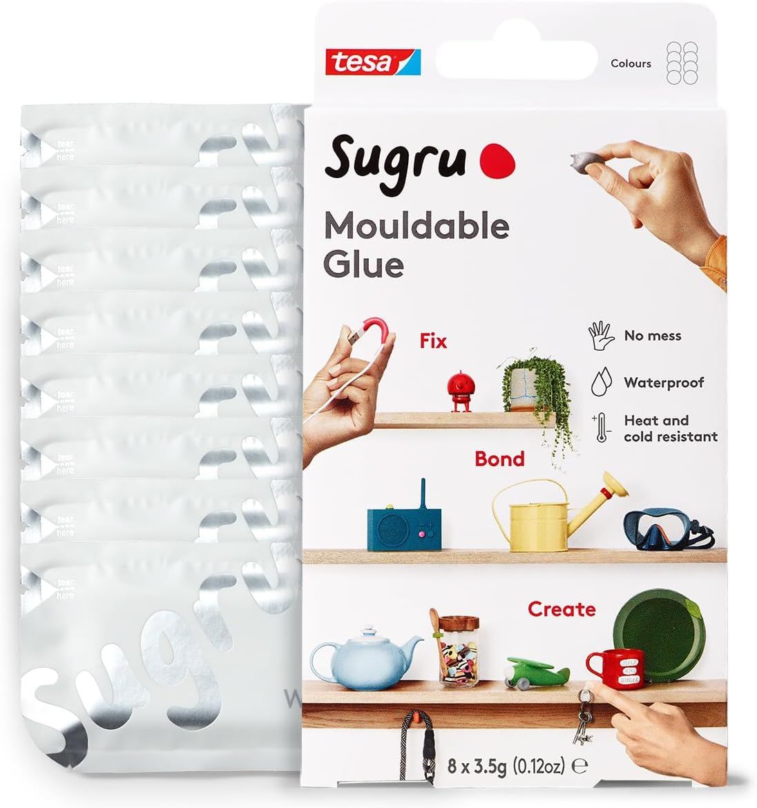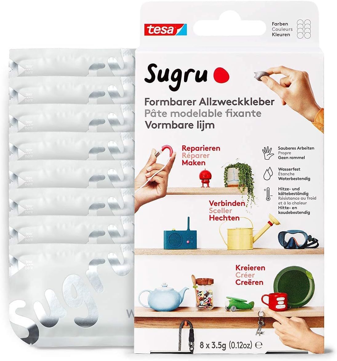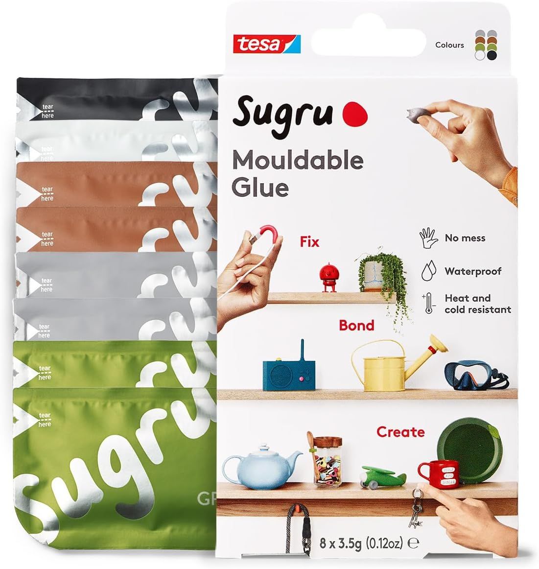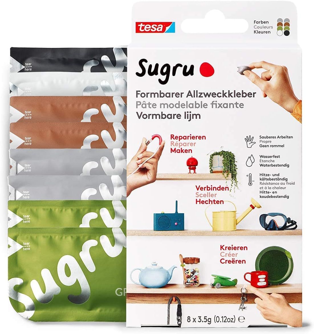 MEVRONISSHOP-Sugru by tesa - Pâte Fixante Polyvalente à Modeler en Lot de 8 x 3.5 g - Pâte Durcissante Adhésive Polyvalente - Pour Réparer, Coller et Fixer sans Percer - Noir, Blanc et Gris