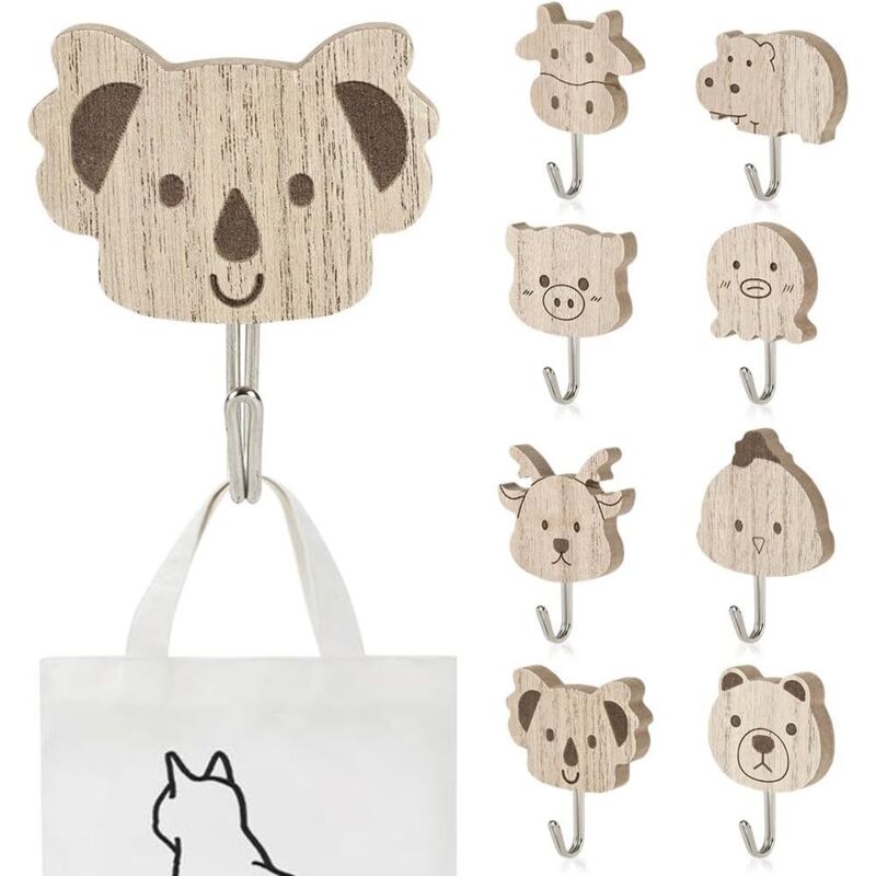 NUTKIT 8 PCS Patere Murale Enfant, Crochet Mural en Bois pour Animaux, Crochets Autocollants en Bois, patere murale bois, pour Vêtements Clés Chapeaux Sacs Bijoux Salle de Bain Chambre Maison