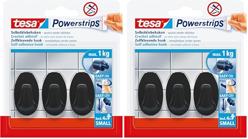 Tesa Powerstrips Crochets Adhésifs Ovale - 3 x Crochets Muraux Autocollants - Accessoire Salle de Bain et Porte-serviette - Fixation Sans Percer - Force de Maintien de 1 kg - Noir (Lot de 2)