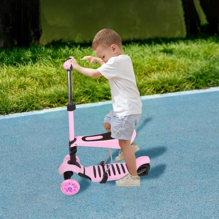 YOLEO 5 en 1 Trottinette EnfantScooter à 3 Roues LEDTrottinette avec Siègetige de poignée arrièrepanierPatinette réglableRose