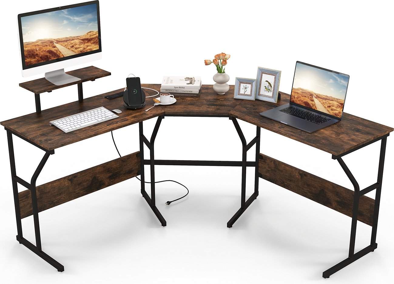 COSTWAY Bureau en L, bureau d'angle réversible avec support d'écran et station de charge, table d'ordinateur gaming, table de bureau Marron rustique