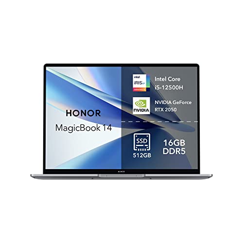HONOR MagicBook 14 PC Portable Gaming, Ordinateur Portable 14 Pouces, Intel Core i5-12500H, NVIDIA GeForce RTX 2050, RAM 16Go, 512Go SSD, Windows 11, Supercharge 135 W, Clavier Rétroéclairé-Gris
