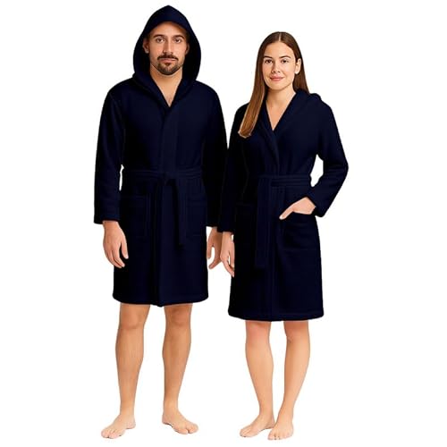 emmevi Peignoir en tissu éponge 100 % coton teinte unie souple avec poches et capuche pour homme femme, tailles S M L XL XXL Médium bleu