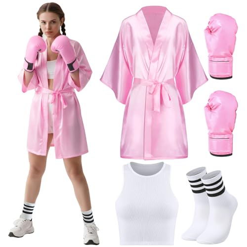 Maiteenly Lot de 5 boxers d'Halloween pour femme adulte avec gants de boxe, bandeau, haut en satin, peignoir, chaussettes et peinture pour le visage pour Halloween et cosplay, Rose, blanc, noir, 35