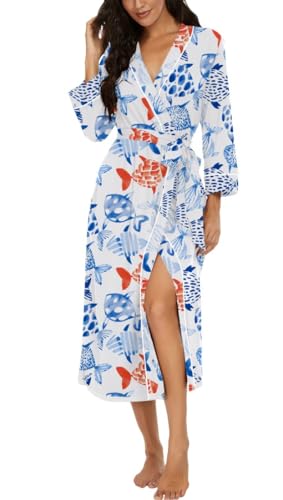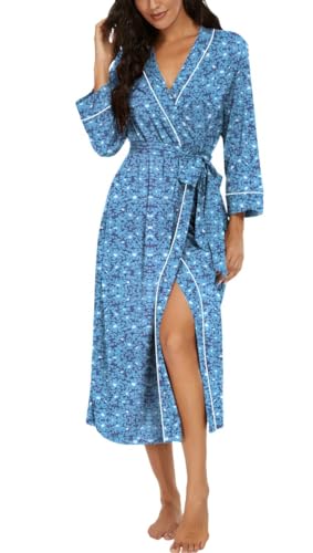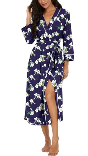 PrinStory Peignoir kimono léger pour femme - Manches 3/4 - Robe de chambre - Vêtement de nuit long - Décontracté - Peignoir de sauna, Fleur bleue., XL