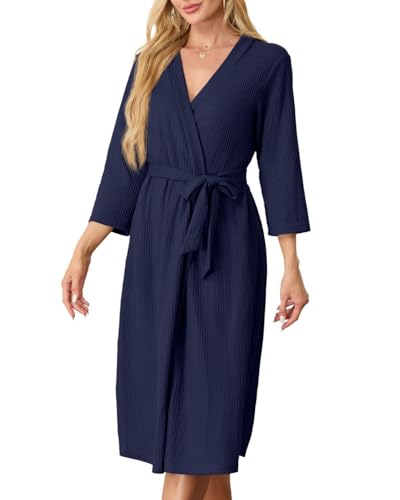 PrinStory Peignoir femme léger gaufré Peignoir femme manches 3/4 col en V Kimono Robes Long vêtement de nuit, bleu marine, L