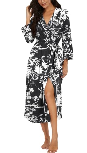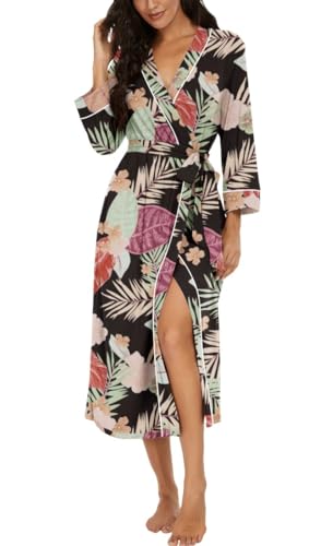 PrinStory Peignoir kimono léger pour femme - Manches 3/4 - Robe de chambre - Vêtement de nuit long - Décontracté - Peignoir de sauna, Noir , XXL