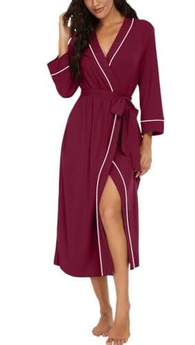 PrinStory Peignoir kimono léger pour femme - Manches 3/4 - Robe de chambre - Vêtement de nuit long - Décontracté - Peignoir de sauna, rouge bordeaux, S