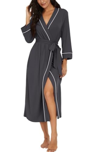 PrinStory Peignoir kimono léger pour femme - Manches 3/4 - Robe de chambre - Vêtement de nuit long - Décontracté - Peignoir de sauna, gris foncé, S