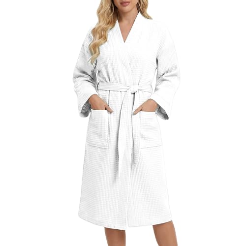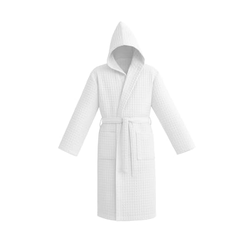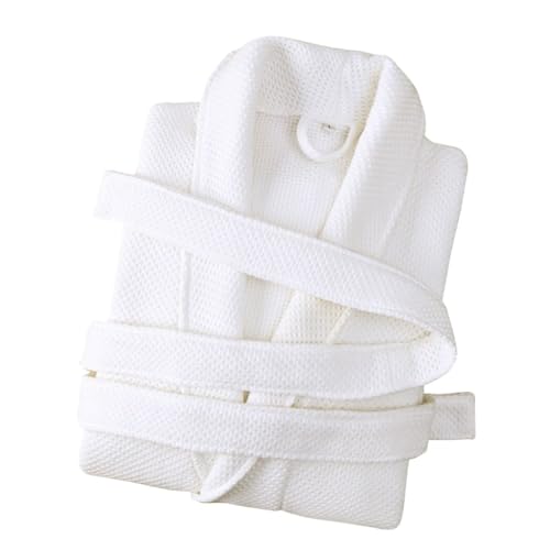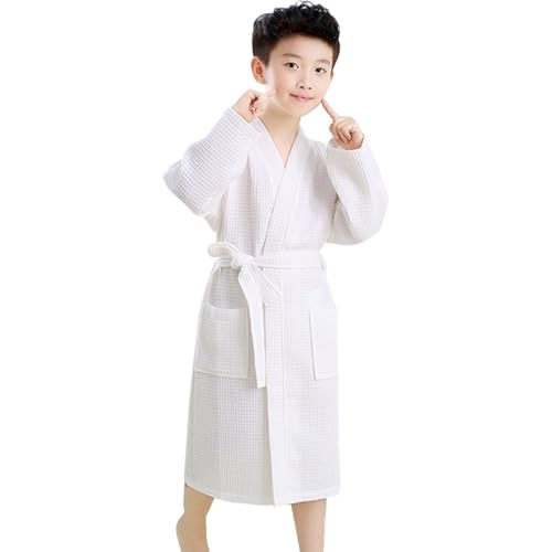 Peignoir Enfants Filles Coton Gaufré, Filles Peignoir Nid D’Abeille Plaid Kimono Robe, White, 8-10 T