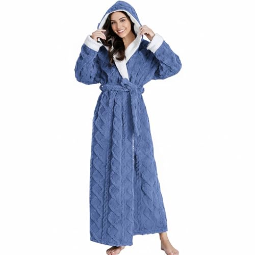 PUTUO Robe de Chambre Femme Polaire: Peignoir de Bain Femme Tres Longue Hiver Chaud Peignoir avec Capuche Bleu Taille M