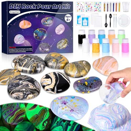 Aragallant Kit de Peinture Pouring sur Pierre Lumineuse pour Enfants, 2 en 1 Loisirs Créatifs Enfant avec 14 Pierre et 10 Couleurs, Activites Manuelles Cadeau Fille Garcon 4 5 6 7 8 9 10 11 12 Ans