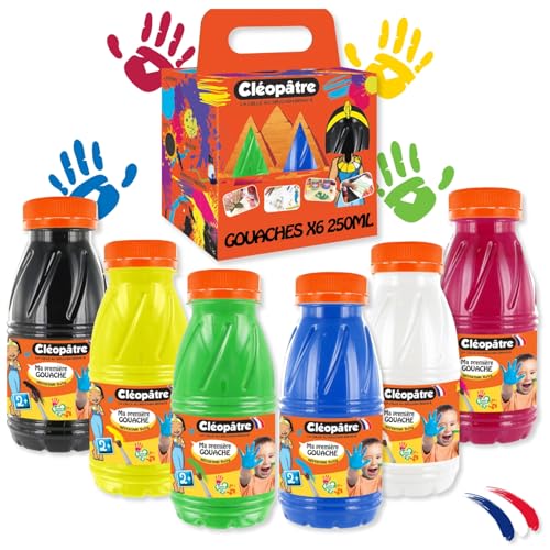 CLEOPATRE Ma Première Gouache Baby 2-en-1 Lot de 6 Bouteilles de Peinture Doigt pour Bébé et Enfant dès 2 Ans, Couleurs Vives Lavables, Couleurs assorties